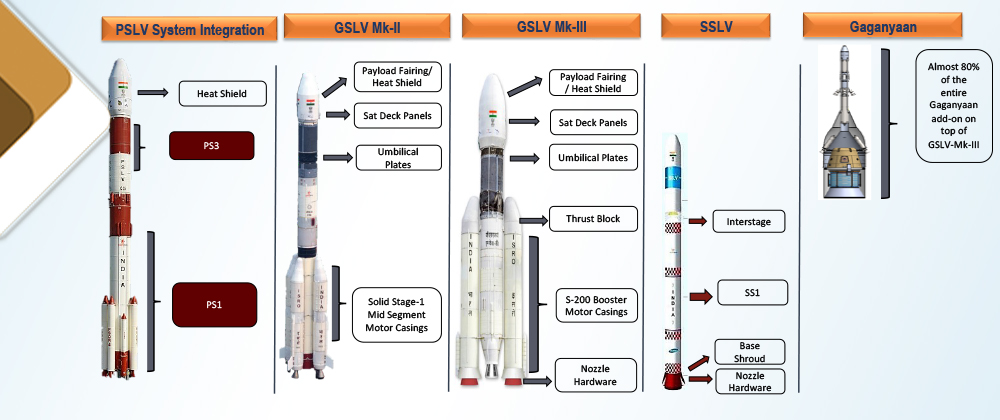 - More than 300 rocket motor casings for PSLV, GSLV and LVM3 programmes. These motor casings for the solid stages of PSLV, GSLV, LVM3 and SSLV made of maraging steel and 15CDV6 are now in serial production
